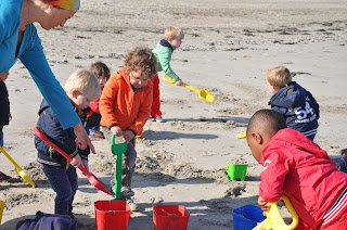 Toen we daar aankwamen stond juf Inge ons op te wachten. Met een bolderkar vol strandspulletjes gingen we aan het werk: